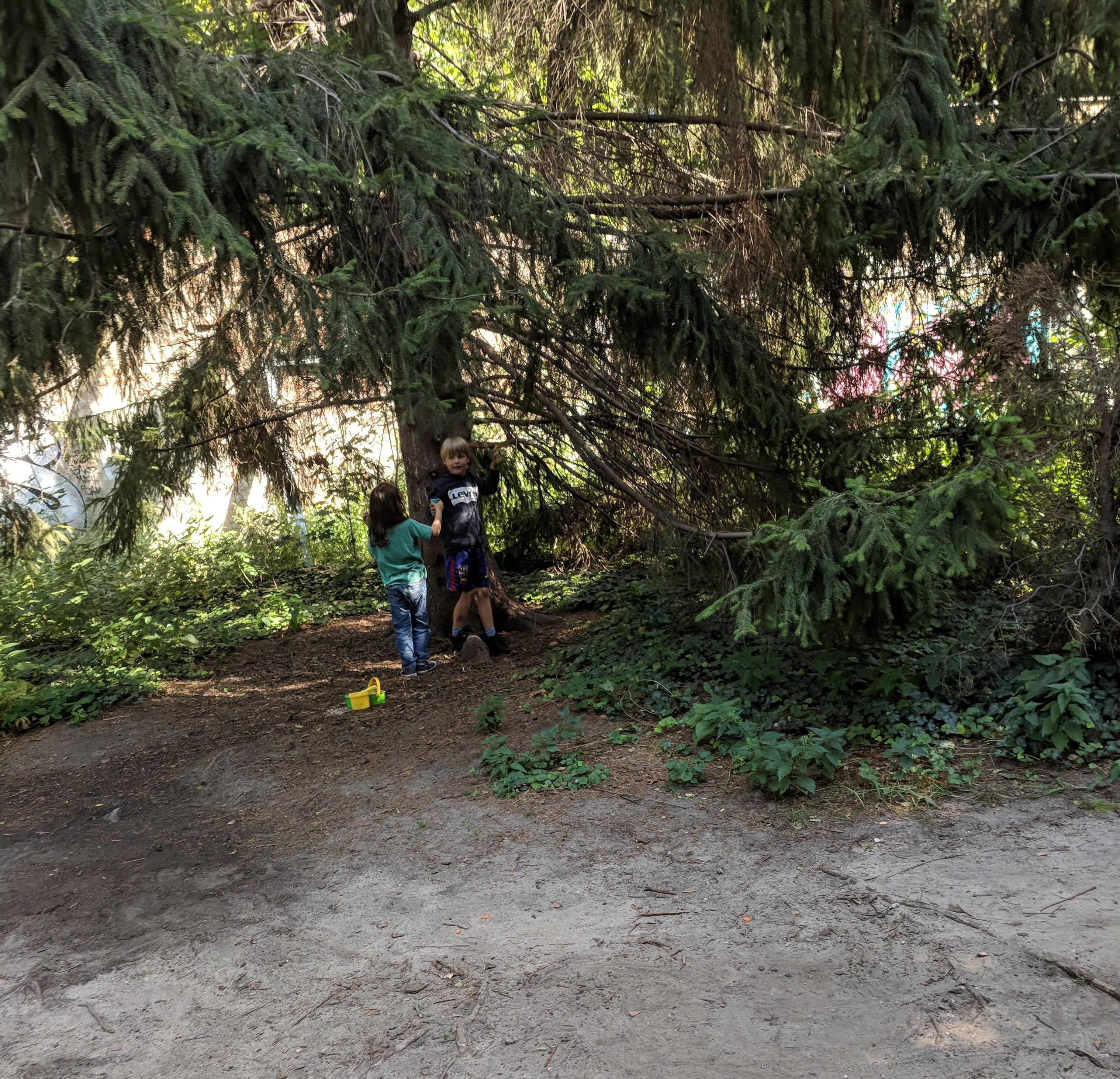 Previous ImageNext Image img_20190717_161657 kids climbing a tall spruce while their parents hang out n hammocks